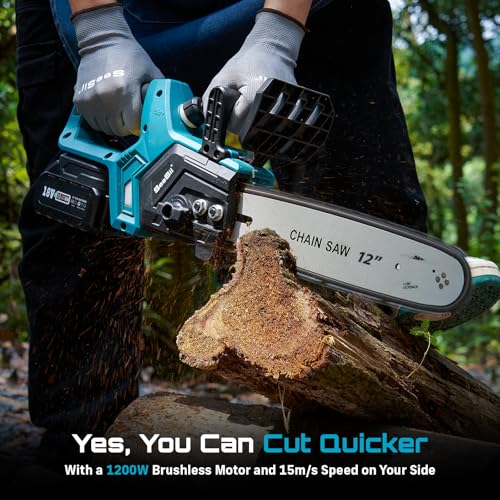 SeeSii accu-kettingzaag met 1200 W borstelloze motor: deze accu-kettingzaag beschikt over een krachtige borstelloze motor, die voor topprestaties, meer looptijd en maximale levensduur zorgt en in tegenstelling tot koolborstels aan motoren onderworpen is – geen slijtage en is daardoor onderhoudsvrij. Zonder brandgeur bij het snijden, zodat je je geen zorgen hoeft te maken over vuur enz.