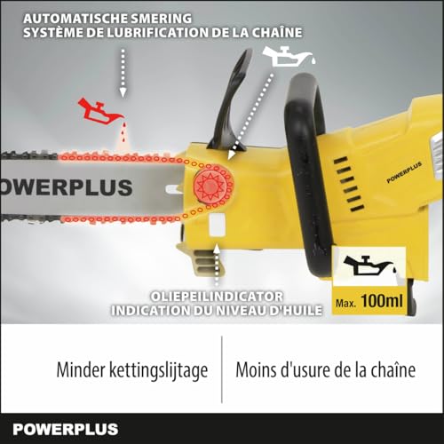 Minder kettingsluiting: de automatische smering met oliepeilindicator vermindert de slijtage van de ketting aanzienlijk en zorgt voor een soepele werking. De olietank heeft een inhoud van 100 ml.